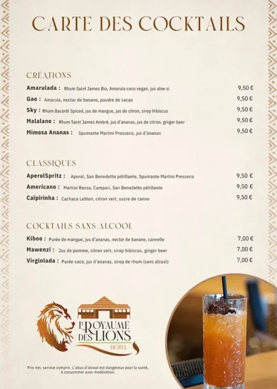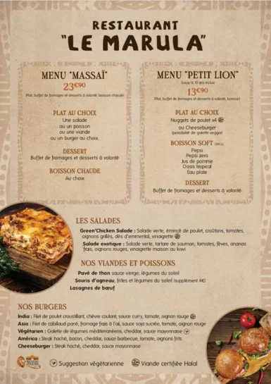 Laissez-vous séduire par une expérience immersive. Au restaurant Le Marula, laissez-vous émerveiller par une vue imprenable sur les lions, que ce soit depuis la salle ou la terrasse.Puis, prolongez l’évasion au Lounge Bar Le Tsavo, où vous pourrez déguster un cocktail exotique en terrasse, dans une ambiance chaleureuse et immersive, bercée par les sons de la savane.