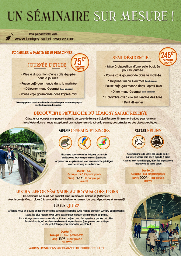 À seulement 40 minutes de Paris, offrez à vos équipes une expérience hors du commun au Royaume des Lions, niché au cœur du Lumigny Safari Reserve. Entre productivité, évasion et immersion totale, transformez vos événements professionnels en moments inoubliables.